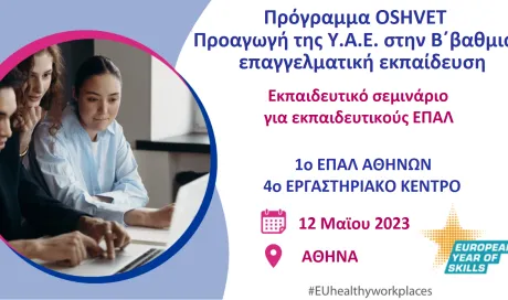 Εκπαιδευτικά σεμινάρια για την Υγεία & Ασφάλεια στην Εργασία στον χώρο της δευτεροβάθμιας επαγγελματικής εκπαίδευσης / Πρόγραμμα OSHVET – ΑΘΗΝΑ, 30 Νοεμβρίου 2023
